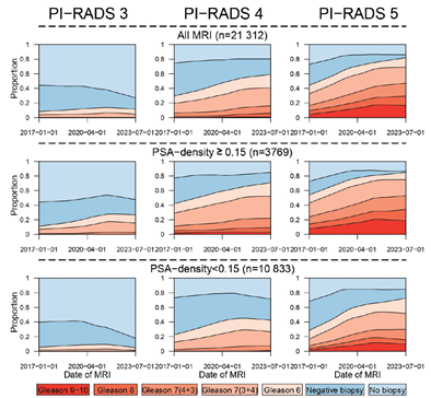 Studien baserades på 108 361 MR-undersökningar av prostata utförda 2015–2023 hos män utan tidigare prostatacancer. En algoritm utvecklades för att extrahera strukturerad information ur de ostrukturerade MR‑rapporterna. Andelen MR‑rapporter där PI‑RADS kunde identifieras ökade från 38 % (2015–2016) till 83 % (2022–2023). Biopsifrekvensen minskade för PI‑RADS 3‑lesioner medan biopsier av PI‑RADS 5 ökade. Nästan alla cancerfall i PI‑RADS 3 var Gleason 6 eller 7 (3+4), medan Gleason 9–10 nästan uteslutande förekom i PI‑RADS 5, och detta samband blev tydligare mot slutet av studieperioden (Figur).